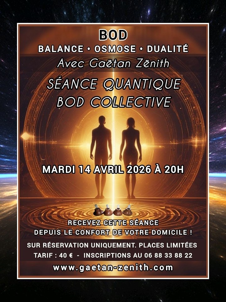 Bonjour ! C'est inédit ! Mardi 14 Avril 2026 à 20H, je vous propose une Séance Quantique BOD Collective, depuis le confort de votre domicile, via Zoom. Modalités d'inscription ci dessous. BOD était jusque là exclusivement disponible en séances individuelles. L'ère de la necessité des actions collectives pour élever la fréquence planétaire à changé la donne et certaines mises à jour spécifiques des encodeurs BOD permettent à présent de réaliser des séances puissantes en petits groupes. Au plaisir de vous accompagner dans cette nouvelle aventure !